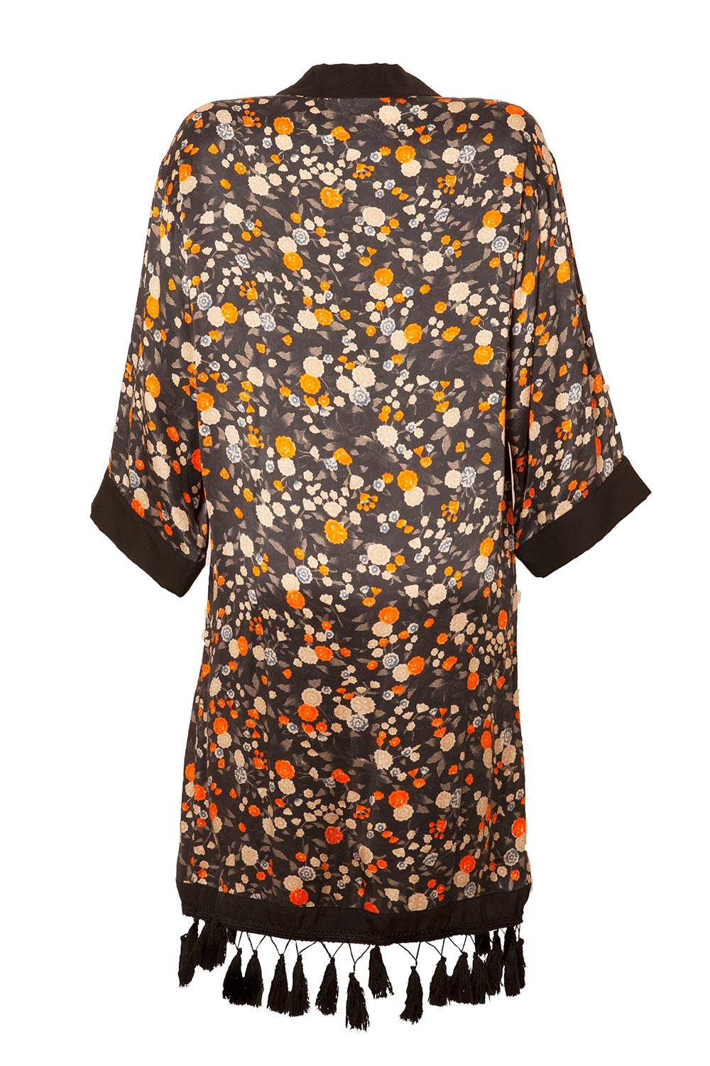 Tags: quimono, kimono, flores, estampa, franjas, seda, preto, laranja