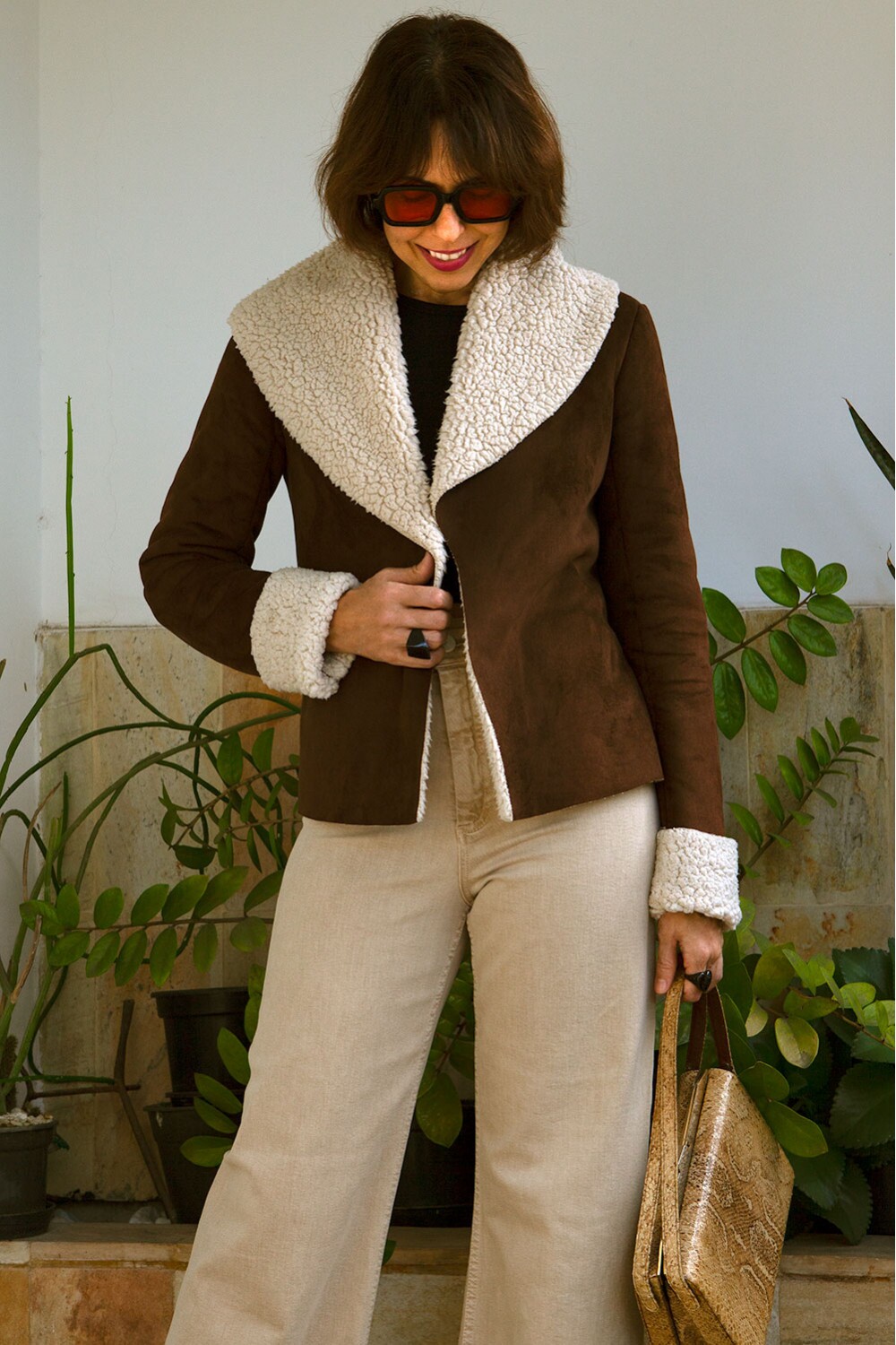 Casaco marrom de suede com avesso de carneirinho, muito quentinho e fofo. A modelagem simples, com a gola virada, sem botões nem bolsos, deixa a peça mais leve mais fácil de combinar com calças de todos os estilos. Confortável e leve, o casaco fica ótimo com malha justinha por baixo, calça cargo e botas. Para criar um look boho, use com um vestido longo estampado leve e botas.